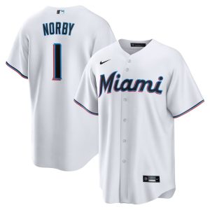 Men’s Miami Marlins #1 Connor Norby Nike White Home Replica Jersey