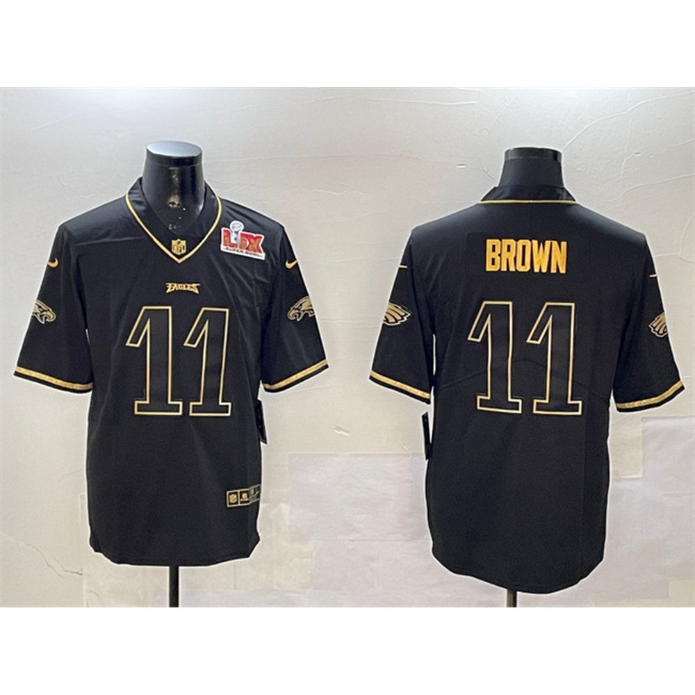 Men’s Philadelphia Eagles #11 A. J. Brown Black/Gold 2025 Super Bowl LIX Patch Salute To Service Vapor Untouchable Limited Stitched Football Jersey