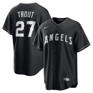 Men’s Los Angeles Angels #27 Mike Trout Nike Black Lights Out Replica Player Jersey
